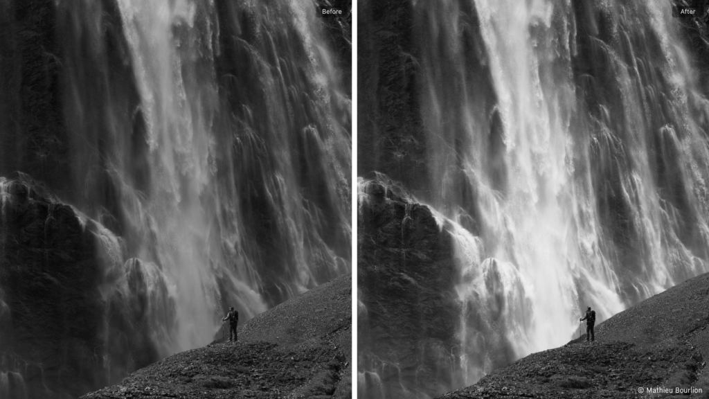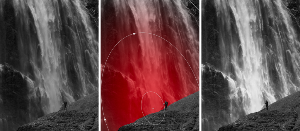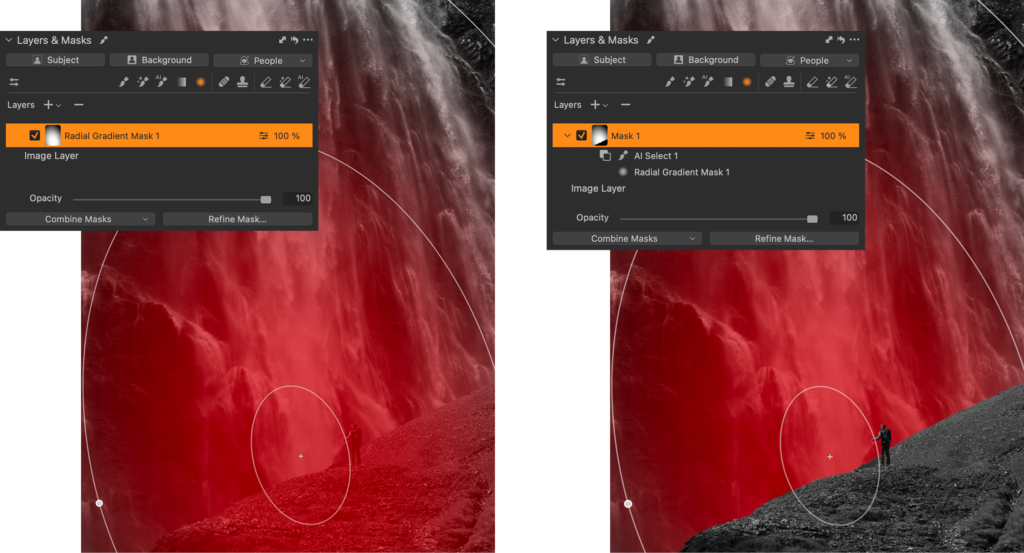 Imagine you have this image of a person in front of a waterfall, and you would like to lighten the waterfall to separate it from the foreground. You could brush it, create a Gradient, use AI Select, or many other options. However, they wouldn’t be as flexible as combining two masks.