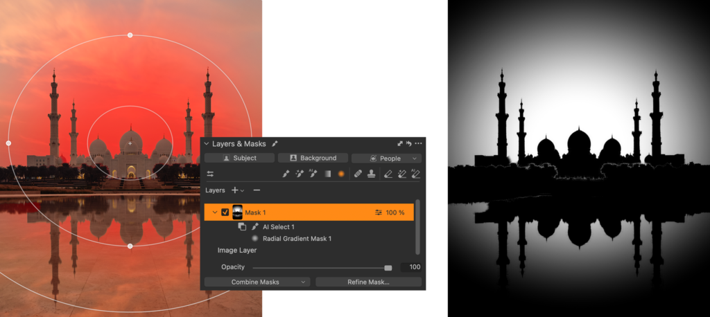 When everything is selected with AI Select, you should end up with a flexible Radial Gradient you can move around behind the mosque, also including the reflection. Here, it’s also shown as a greyscale mask (Option/Alt + M) to easily visualize the mask.