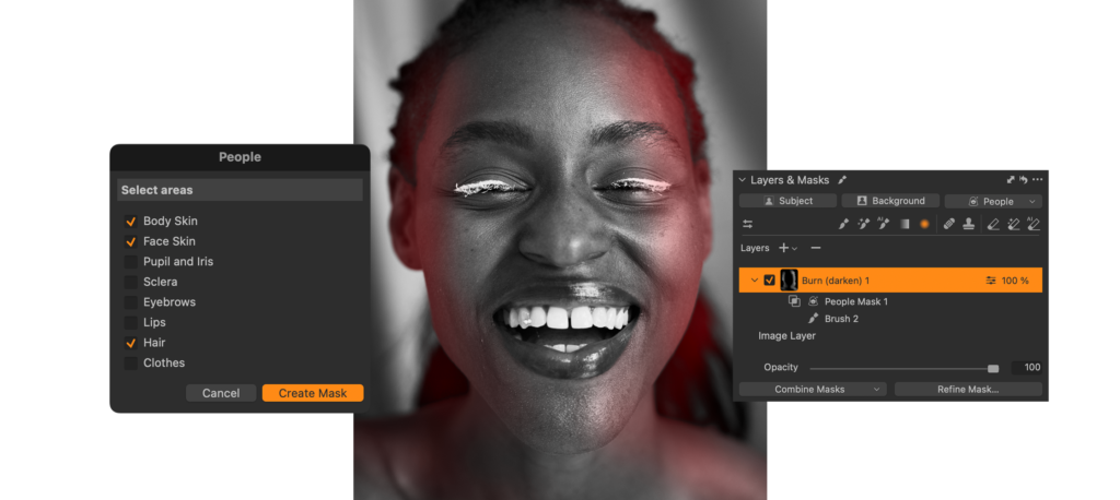 First, you select the ‘Burn (darken)’ Style Brush and make a brush stroke on the edge of the face of the model. This automatically creates a new Layer. Now you intersect this mask with the ‘People’ mask option. Here you select ‘Face Skin’, ‘Body Skin’ and ‘Hair’. Now your mask is restricted to only the skin and hair of the model, and you can brush around the edge without affecting background.