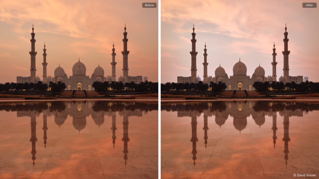 Adjusting light, contrast, white balance, and clarity creates a nice separation between the mosque and the background.