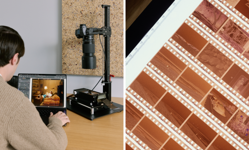 A camera-based scanning setup with a stable film carrier helps keep the negative sharp, while an even, consistent light source ensures uniform exposure across the frame. When the camera is tethered to Capture One, exposure warnings make it easy to immediately see whether a capture is over- or underexposed, so adjustments can be made before moving on. The process helps ensure each negative is captured properly and provides a solid foundation for conversion.