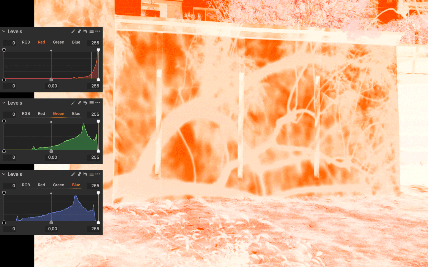 The image is then inverted to produce the initial positive result, while retaining the full captured information for further editing. From there, the Levels tool defines the black and white points, expanding the film’s density range into a usable positive tonal range. The data is redistributed within the available range rather than prematurely discarded.