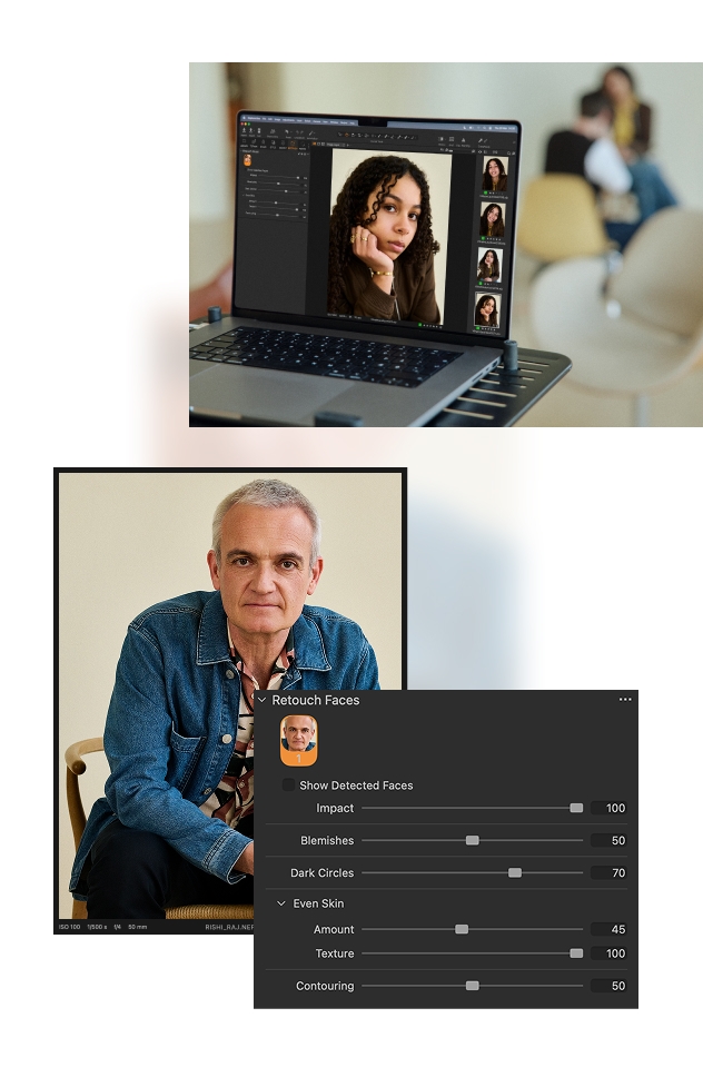 Start editing immediately with auto-detected faces and easy-to-use sliders. You can tether and retouch live, allowing you to speed through post-production by copying edits across shots.