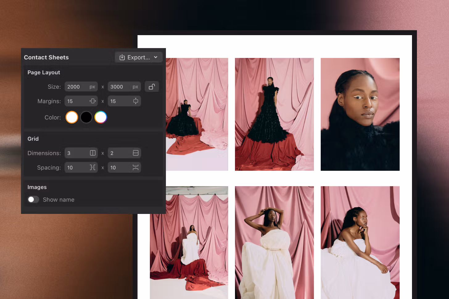 Create and export customizable contact sheets with custom canvas size, grid layout, and output options in a heartbeat.